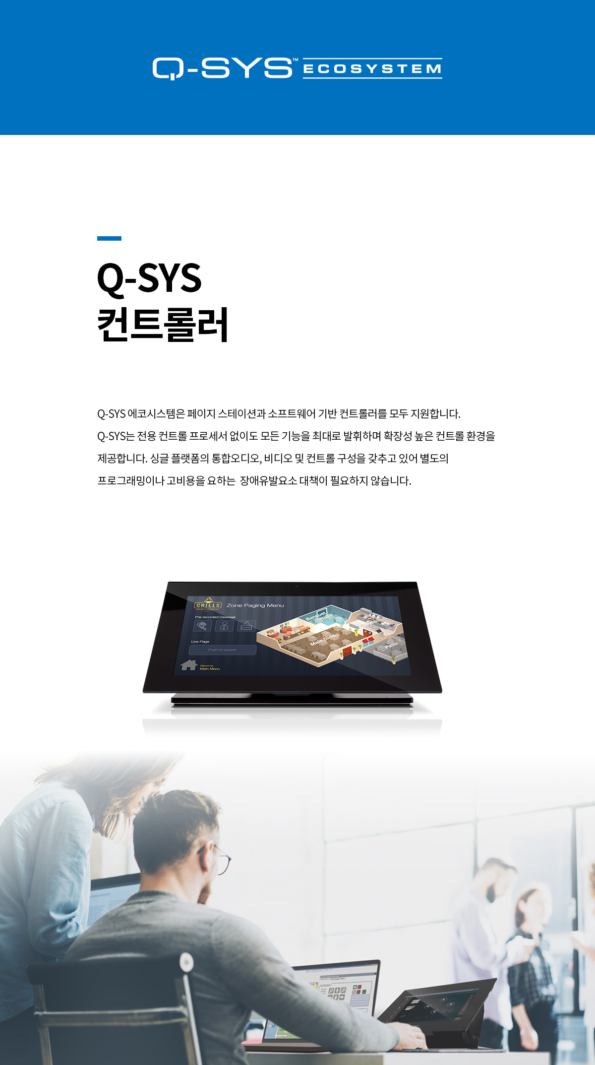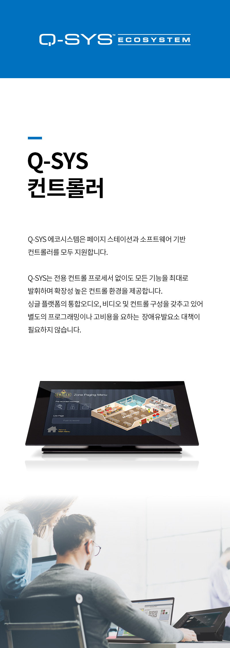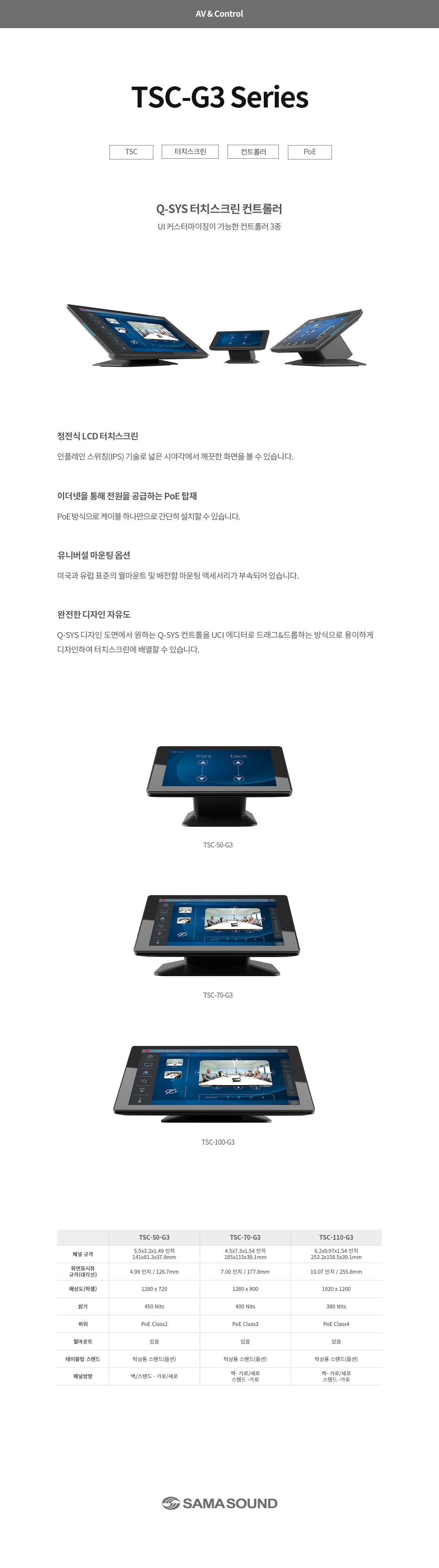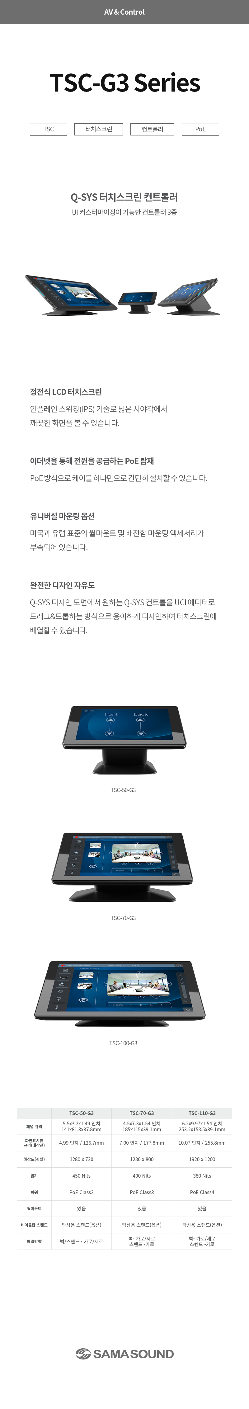 TSC-G3 Series는 UI 커스터마이징이 가능한 터치스크린 컨트롤러입니다. Q-SYS 디자인 도면에서 원하는 Q-SYS 컨트롤을 UCI 에디터로 드래그&드롭하는 방식으로 용이하게 디자인하여 터치스크린에 배열할 수 있습니다. 인플레인 스위칭(IPS) 기술로 넓은 시야각에서 깨끗한 화면을 볼 수 있으며 PoE 방식으로 케이블 하나만으로 간단한 설치가 가능합니다.