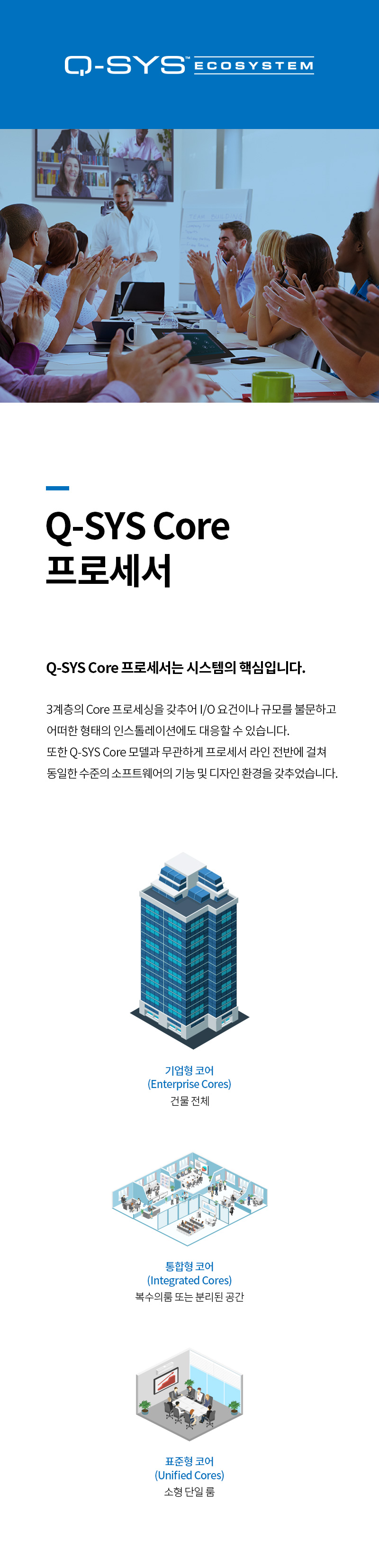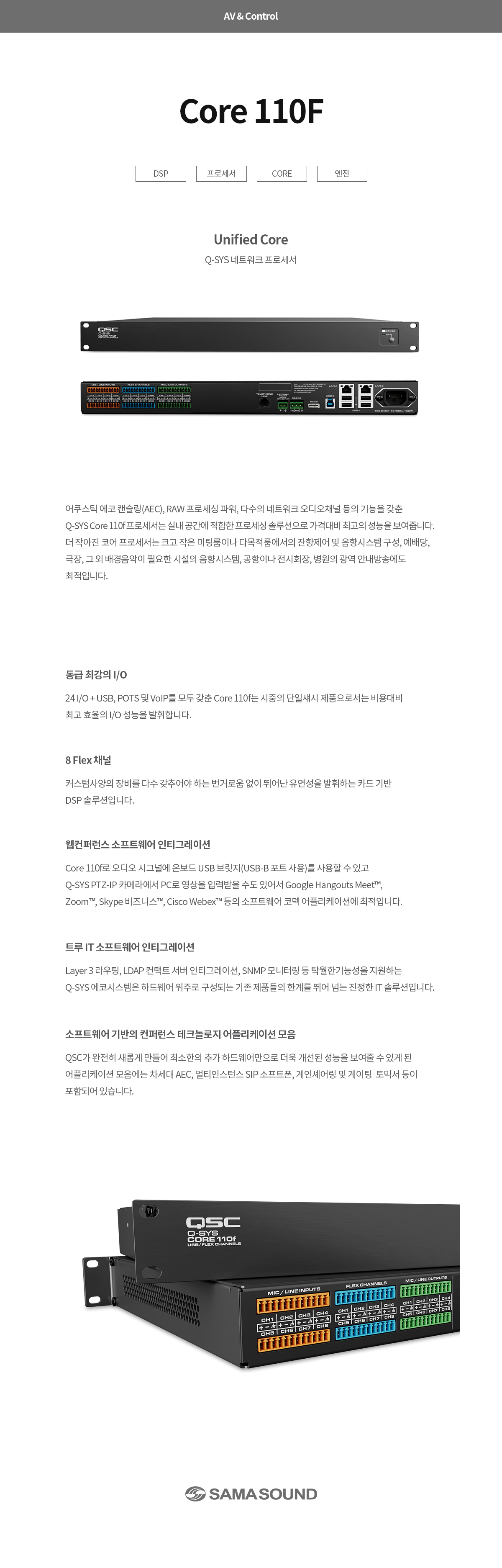 어쿠스틱 에코 캔슬링(AEC), RAW 프로세싱 파워, 다수의 네트워크 오디오채널 등의 기능을 갖춘 Q-SYS Core 110f 프로세서는 실내 공간에 적합한 프로세싱 솔루션으로 가격대비 최고의 성능을 보여줍니다. 더 작아진 코어 프로세서는 크고 작은 미팅룸이나 다목적룸에서의 잔향제어 및 음향시스템 구성, 예배당, 극장, 그 외 배경음악이 필요한 시설의 음향시스템, 공항이나 전시회장, 병원의 광역 안내방송에도 최적입니다.