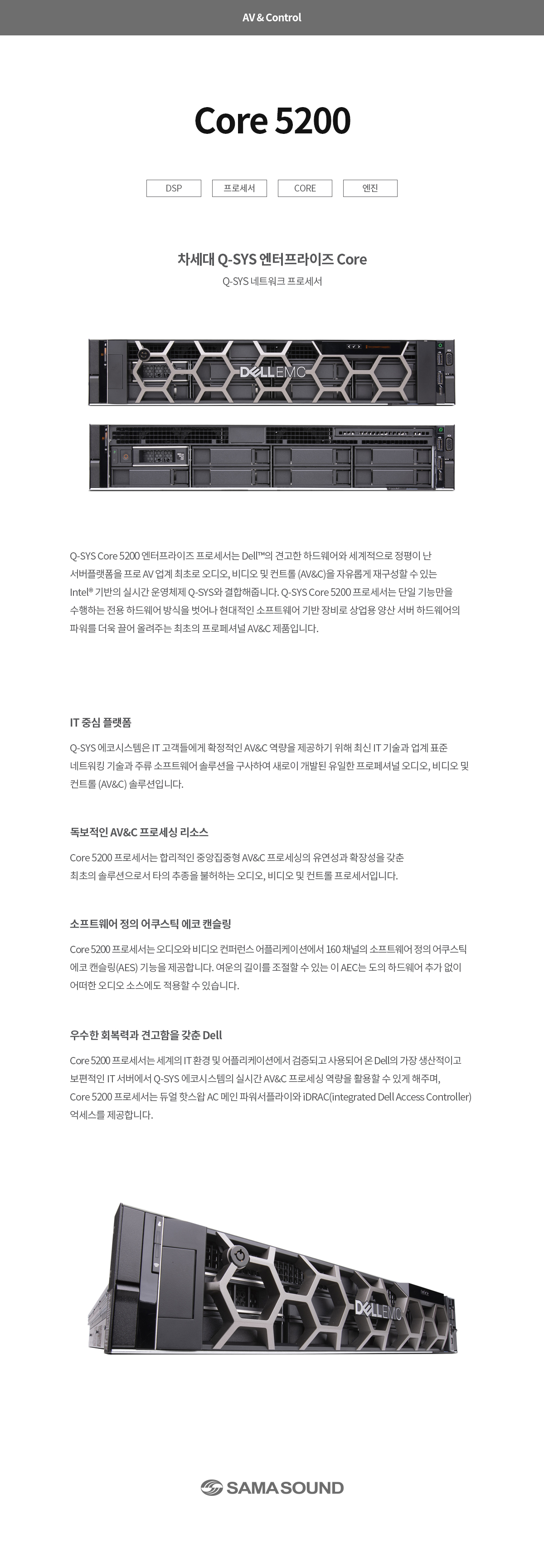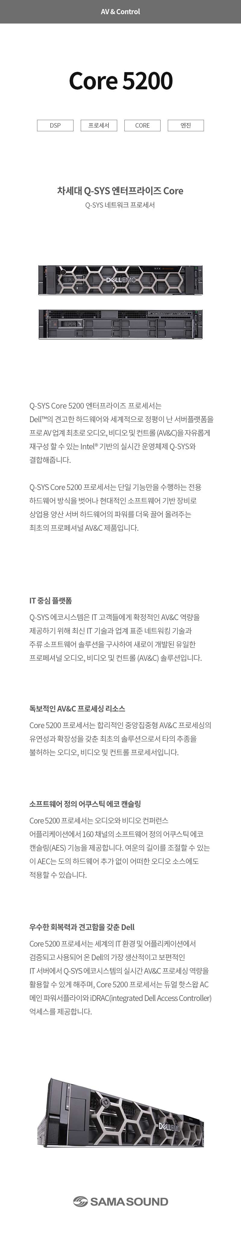 Q-SYS Core 5200 엔터프라이즈 프로세서는 Dell™의 견고한 하드웨어와 세계적으로 정평이 난 서버플랫폼을 프로 AV 업계 최초로 오디오, 비디오 및 컨트롤 (AV&C)을 자유롭게 재구성할 수 있는 Intel® 기반의 실시간 운영체제 Q-SYS와 결합해줍니다. Q-SYS Core 5200 프로세서는 단일 기능만을 수행하는 전용 하드웨어 방식을 벗어나 현대적인 소프트웨어 기반 장비로 상업용 양산 서버 하드웨어의 파워를 더욱 끌어 올려주는 최초의 프로페셔널 AV&C 제품입니다.