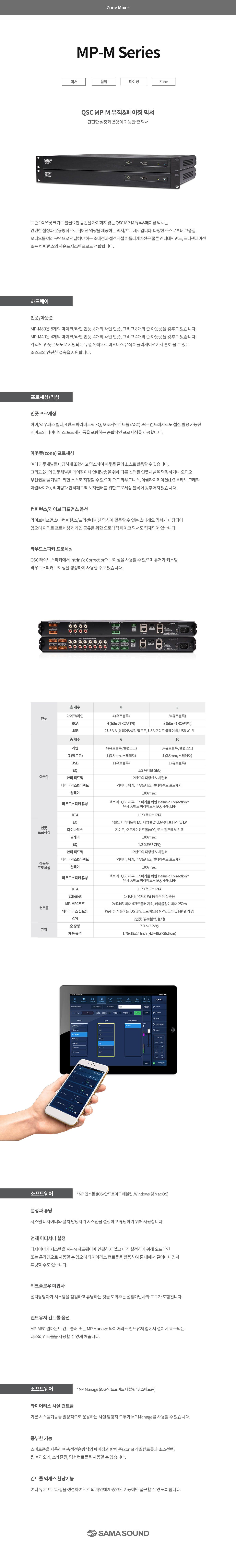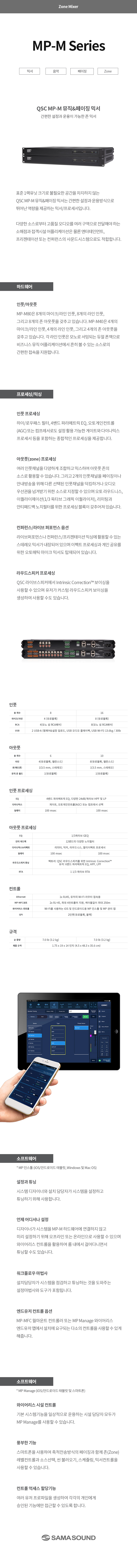표준 1랙유닛 크기로 불필요한 공간을 차지하지 않는 QSC MP-M 뮤직&페이징 믹서는 간편한 설정과 운용방식으로 뛰어난 역량을 제공하는 믹서/프로세서입니다. 다양한 소스로부터 고품질 오디오를 여러 구역으로 전달해야 하는 소매점과 접객시설 어플리케이션은 물론 엔터테인먼트, 프리젠테이션 또는 컨퍼런스의 사운드시스템으로도 적합합니다.
