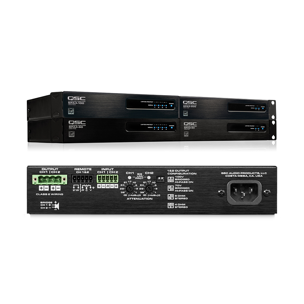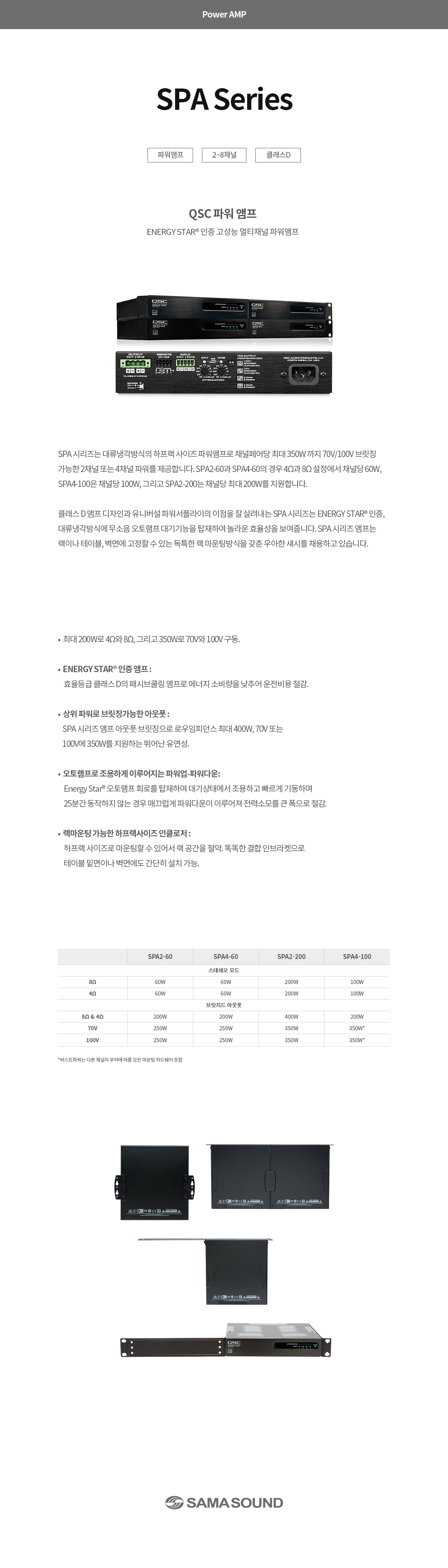 SPA 시리즈는 대류냉각방식의 하프랙 사이즈 파워앰프로 채널페어당 최대 350W 까지 70V/100V 브릿징 가능한 2채널 또는 4채널 파워를 제공합니다. SPA2-60과 SPA4-60의 경우 4Ω과 8Ω 설정에서 채널당 60W, SPA4-100은 채널당 100W, 그리고 SPA2-200는 채널당 최대 200W를 지원합니다. 클래스 D 앰프 디자인과 유니버설 파워서플라이의 이점을 잘 살려내는 SPA 시리즈는 ENERGY STAR® 인증, 대류냉각방식에 무소음 오토램프 대기기능을 탑재하여 놀라운 효율성을 보여줍니다. SPA 시리즈 앰프는 랙이나 테이블, 벽면에 고정할 수 있는 독특한 랙 마운팅방식을 갖춘 우아한 섀시를 채용하고 있습니다.