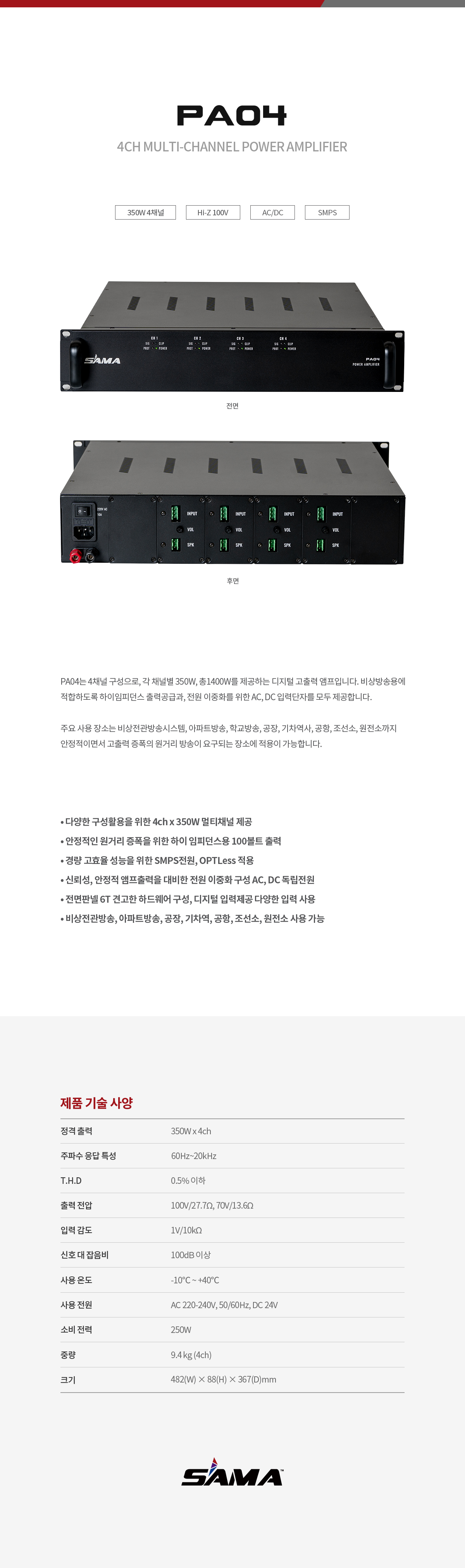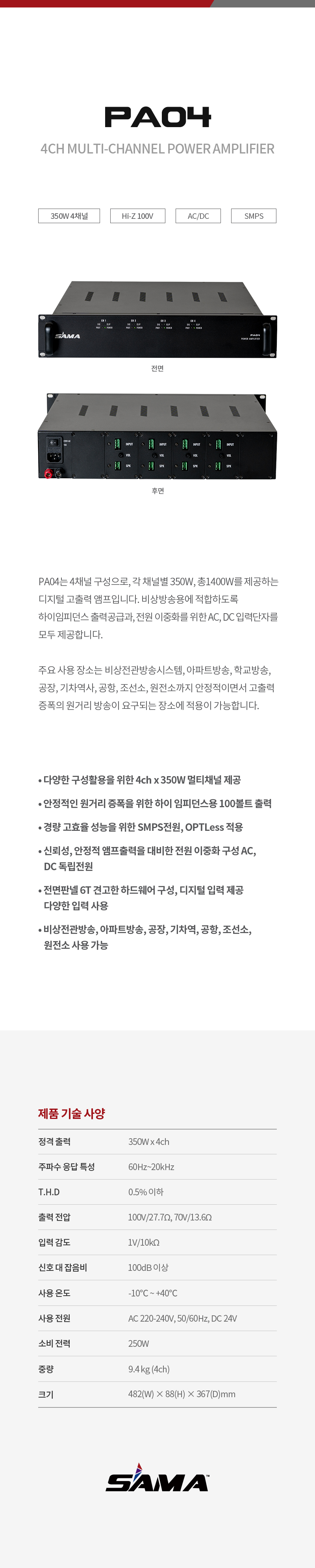 PA04는 4채널 구성으로, 각 채널별 350W, 총1400W를 제공하는 디지털 고출력 앰프입니다. 비상방송용에 적합하도록 하이임피던스 출력공급과, 전원 이중화를 위한 AC, DC 입력단자를 모두 제공합니다. 주요 사용 장소는 비상전관방송시스템, 아파트방송, 학교방송, 공장, 기차역사, 공항, 조선소, 원전소까지 안정적이면서 고출력 증폭의 원거리 방송이 요구되는 장소에 적용이 가능합니다.