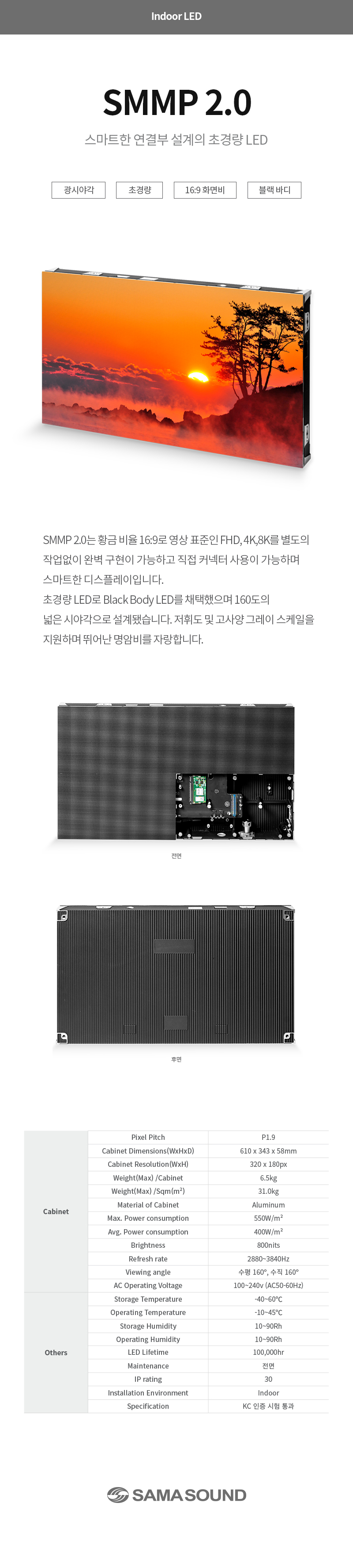 SMMP 2.0는 황금 비율 16:9로 영상 표준인 FHD, 4K,8K를 별도의 작업없이 완벽 구현이 가능하고 직접 커넥터 사용이 가능하며 스마트한 디스플레이입니다. 초경량 LED로 Black Body LED를 채택했으며 160도의 넓은 시야각으로 설계됐습니다. 저휘도 및 고사양 그레이 스케일을 지원하며 뛰어난 명암비를 자랑합니다.