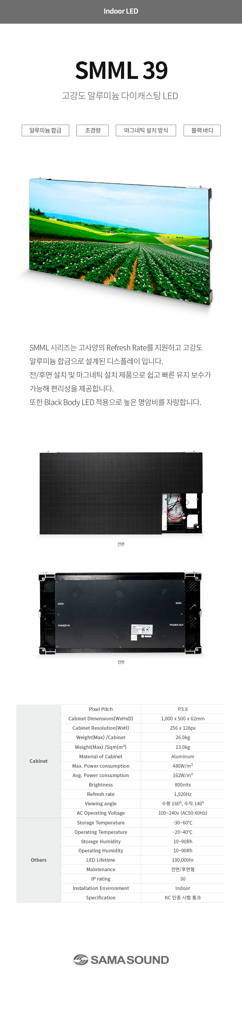 SMML 시리즈는 고사양의 Refresh Rate를 지원하고 고강도 알루미늄 합금으로 설계된 디스플레이 입니다. 전/후면 설치 및 마그네틱 설치 제품으로 쉽고 빠른 유지 보수가 가능해 편리성을 제공합니다. 또한 Black Body LED 적용으로 높은 명암비를 자랑합니다.