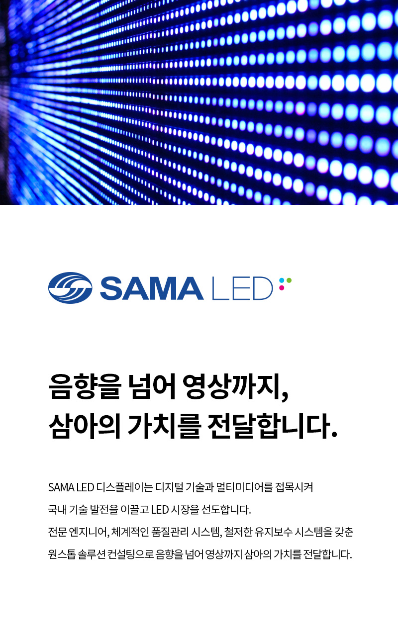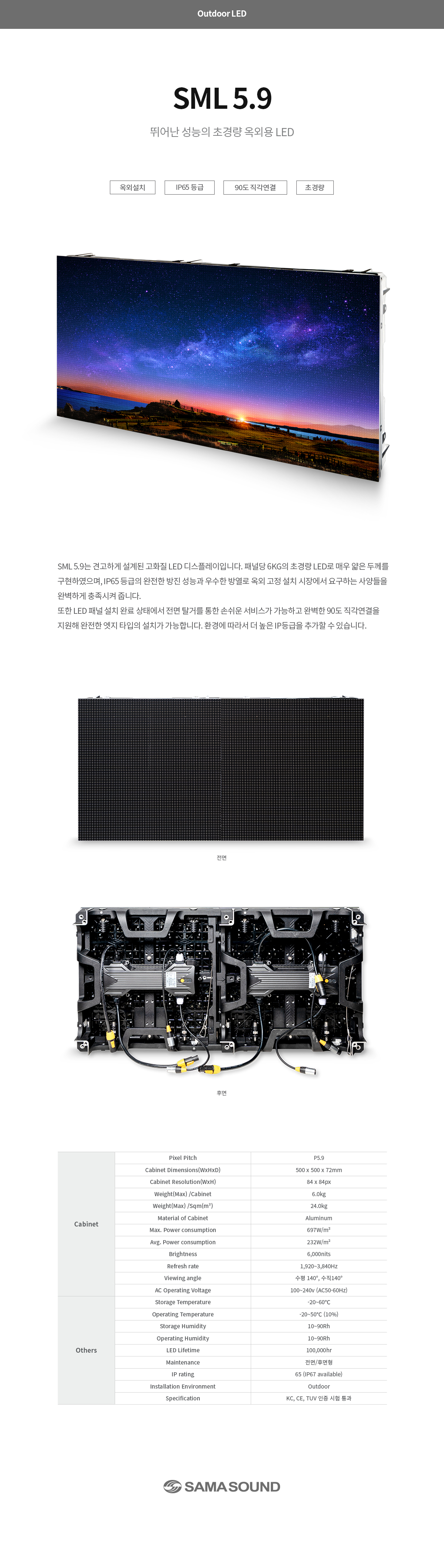 SML 5.9는 견고하게 설계된 고화질 LED 디스플레이입니다. 패널당 6KG의 초경량 LED로 매우 얇은 두께를 구현하였으며, IP65 등급의 완전한 방진 성능과 우수한 방열로 옥외 고정 설치 시장에서 요구하는 사양들을 완벽하게 충족시켜 줍니다. 또한 LED 패널 설치 완료 상태에서 전면 탈거를 통한 손쉬운 서비스가 가능하고 완벽한 90도 직각연결을 지원해 완전한 엣지 타입의 설치가 가능합니다. 환경에 따라서 더 높은 IP등급을 추가할 수 있습니다.