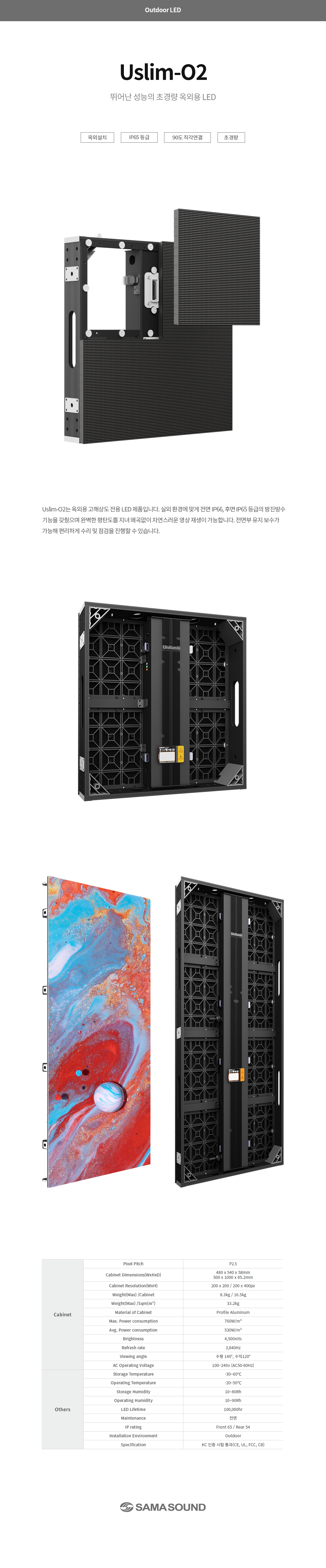 Uslim O2는 옥외용 고해상도 전용 LED 제품입니다. 실외 환경에 맞게 전면 IP65, 후면 IP 54 등급의 방진방수 기능을 갖췄으며 완벽한 평탄도를 지녀 왜곡없이 자연스러운 영상 재생이 가능합니다. 전면부 유지 보수가 가능해 편리하게 수리 및 점검을 진행할 수 있습니다.