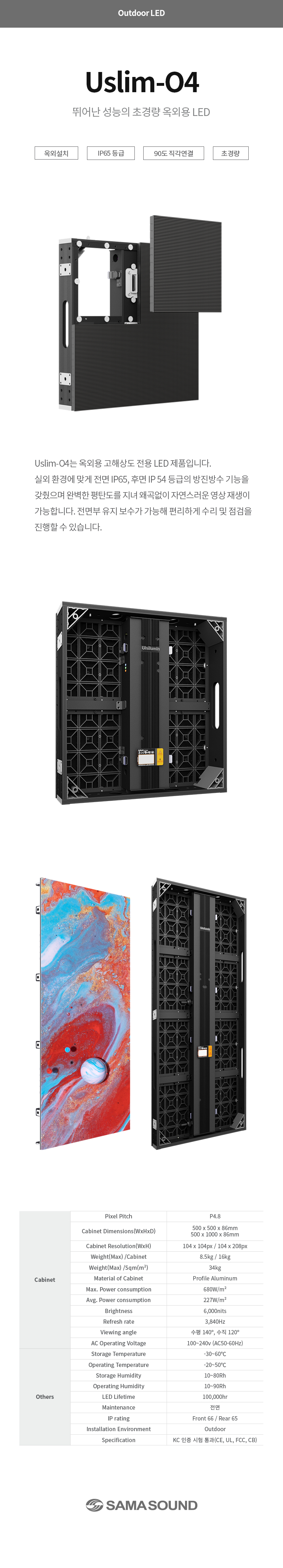 Uslim O4는 옥외용 고해상도 전용 LED 제품입니다. 실외 환경에 맞게 전면 IP65, 후면 IP 54 등급의 방진방수 기능을 갖췄으며 완벽한 평탄도를 지녀 왜곡없이 자연스러운 영상 재생이 가능합니다. 전면부 유지 보수가 가능해 편리하게 수리 및 점검을 진행할 수 있습니다.