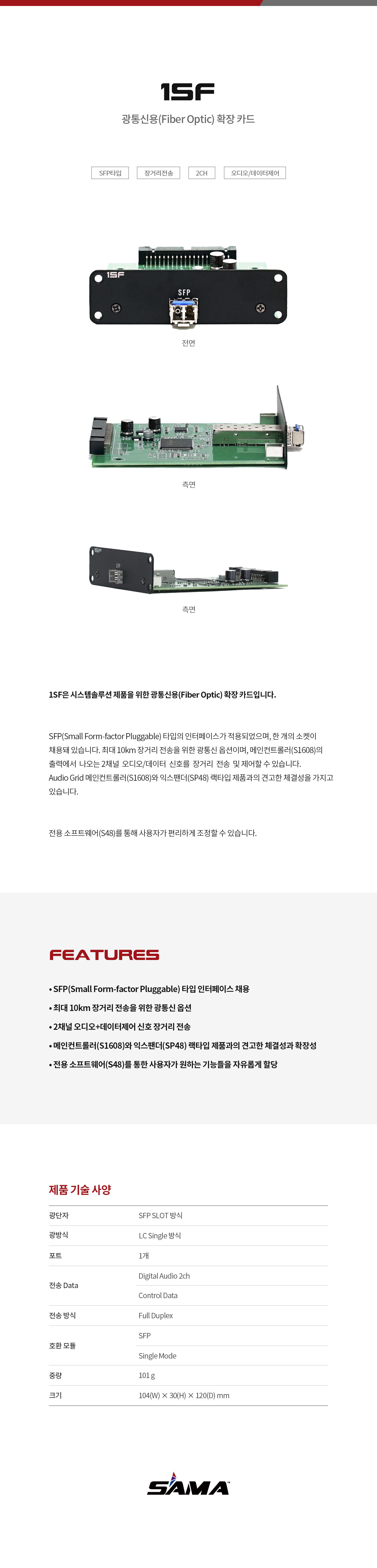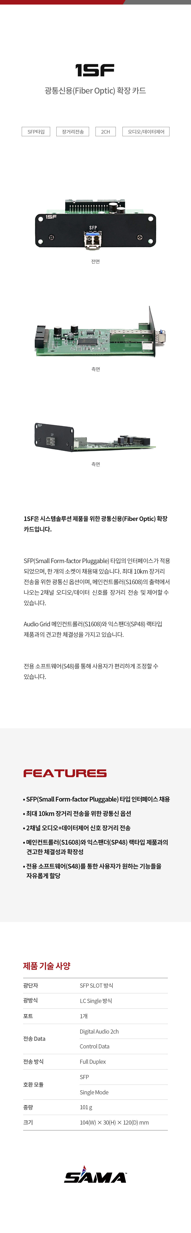 1SF은 시스템솔루션 제품을 위한 광통신용(Fiber Optic) 확장 카드입니다. SFP(Small Form-factor Pluggable) 타입의 인터페이스가 적용되었으며, 한 개의 소켓이 채용돼 있습니다. 최대 10km 장거리 전송을 위한 광통신 옵션이며, 메인컨트롤러(S1608)의 출력에서 나오는 2채널 오디오/데이터 신호를 장거리 전송 및 제어할 수 있습니다.