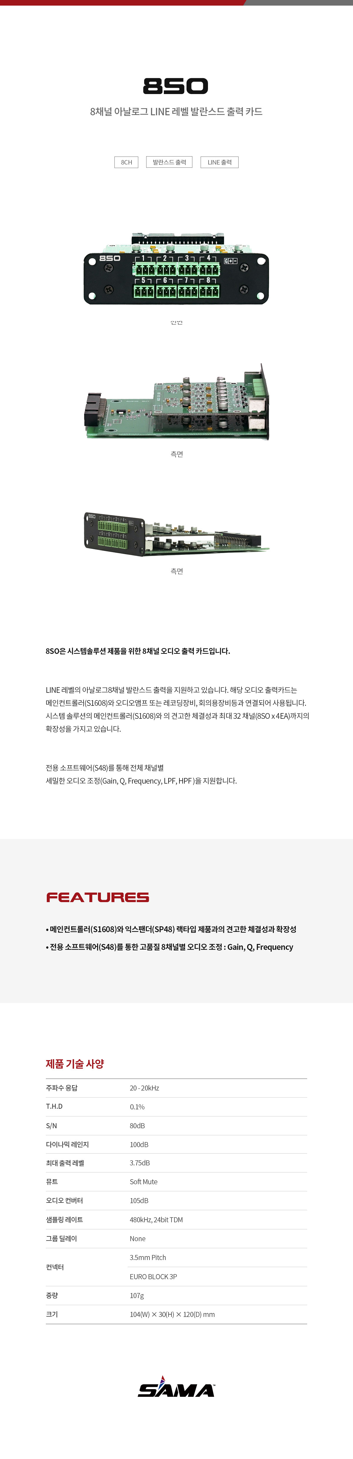 8SO은 시스템솔루션 제품을 위한 8채널 오디오 출력 카드입니다. LINE 레벨의 아날로그8채널 발란스드 출력을 지원하고 있습니다. 해당 오디오 출력카드는 메인컨트롤러(S1608)와 오디오앰프 또는 레코딩장비, 회의용장비등과 연결되어 사용됩니다.