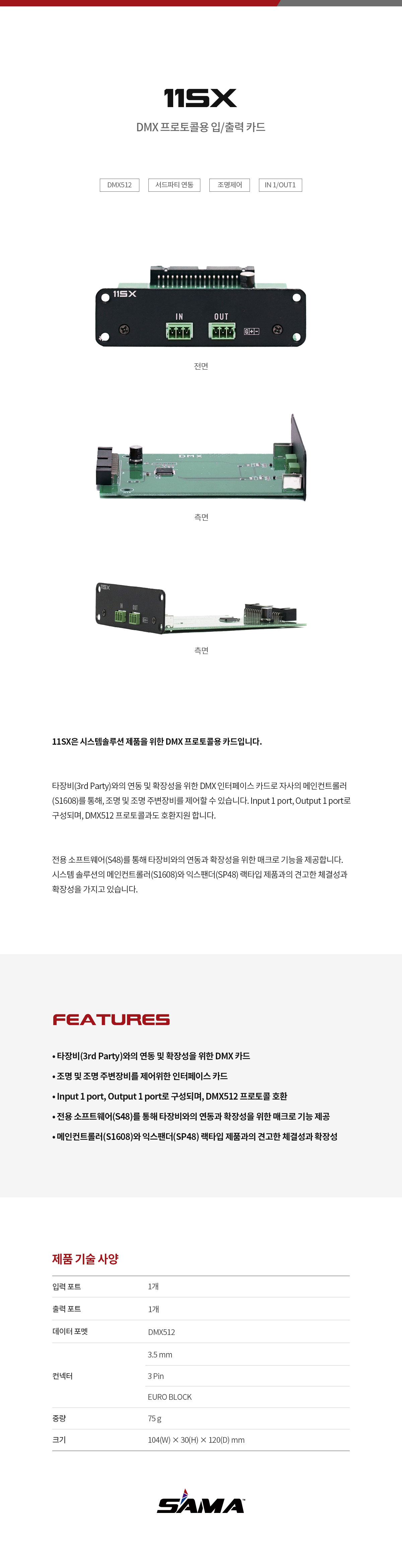 11SX은 시스템솔루션 제품을 위한 DMX 프로토콜용 카드입니다. 타장비(3rd Party)와의 연동 및 확장성을 위한 DMX 인터페이스 카드로 자사의 메인컨트롤러(S1608)를 통해, 조명 및 조명 주변장비를 제어할 수 있습니다.