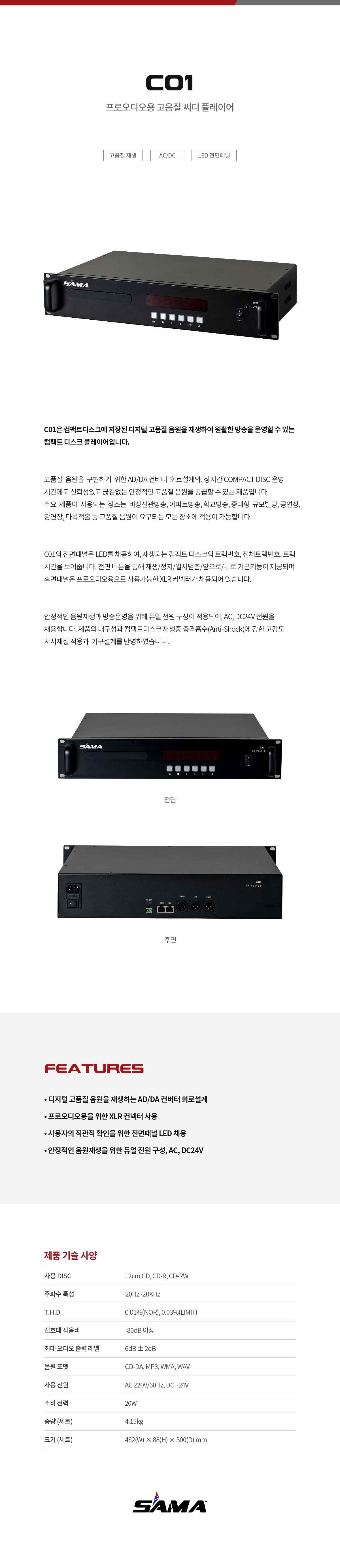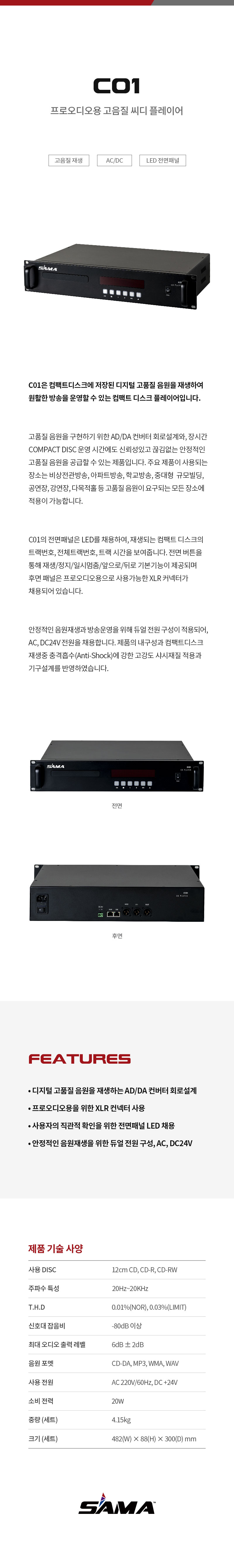 C01은 컴팩트디스크에 저장된 디지털 고품질 음원을 재생하여 원활한 방송을 운영할 수 있는 컴팩트 디스크 플레이어입니다. 고품질 음원을 구현하기 위한 AD/DA 컨버터 회로설계와 장시간 COMPACT DISC 운영시간에도 신뢰성있고 끊김없는 안정적인 고품질 음원을 공급할 수 있는 제품입니다.