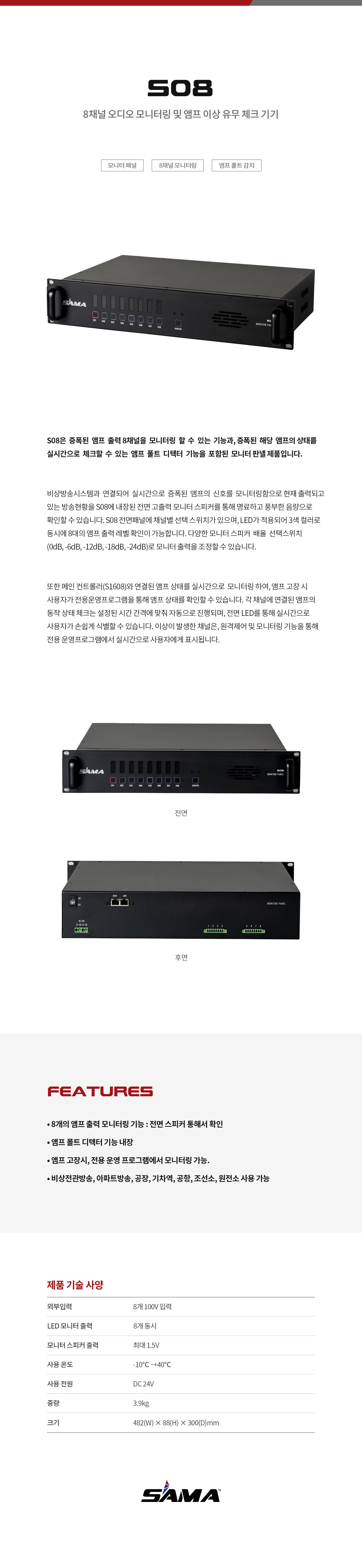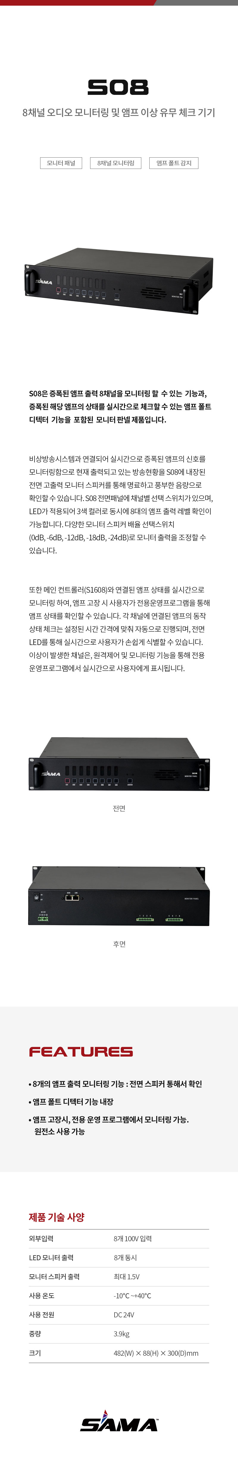 S08은 증폭된 앰프 출력 8채널을 모니터링 할 수 있는 기능과 증폭된 해당 앰프의 상태를 실시간으로 체크할 수 있는 앰프 폴트 디텍터 기능을 포함된 모니터 판넬 제품입니다.