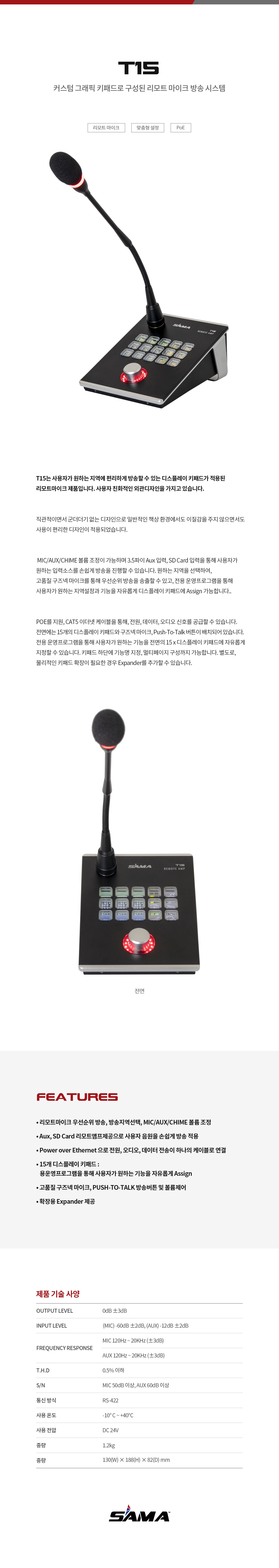 T15는 사용자가 원하는 지역에 편리하게 방송할 수 있는 디스플레이 키패드가 적용된 리모트마이크 제품입니다. 사용자 친화적인 외관디자인을 가지고 있습니다. 직관적이면서 군더더기 없는 디자인으로 일반적인 책상 환경에서도 이질감을 주지 않으면서도 사용이 편리한 디자인이 적용되었습니다.